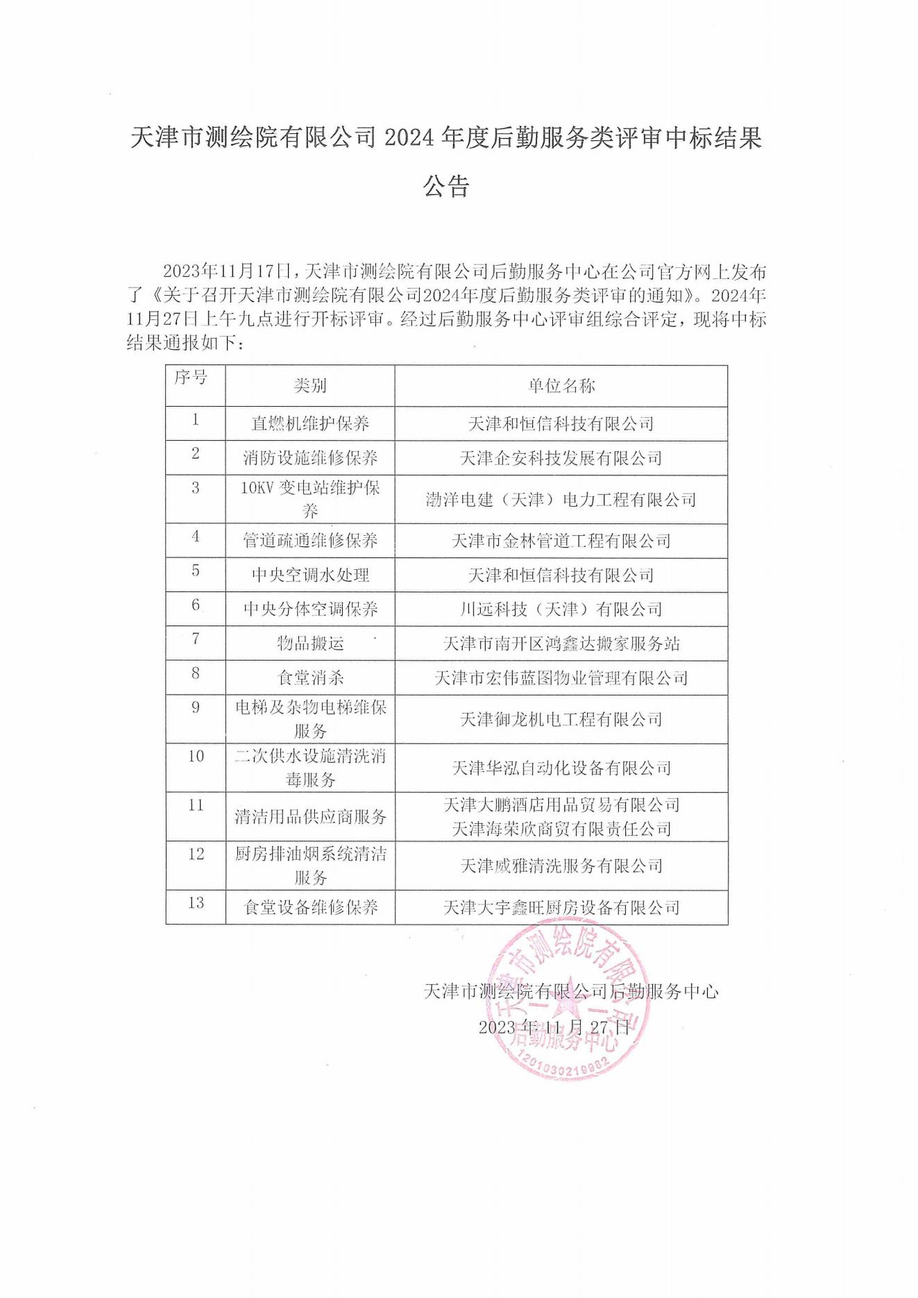 天津市測繪院有限公司2024年度后勤服務類評審中標結果公告 2023-11-29